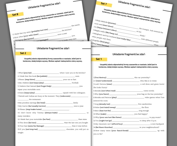 Materiał zawiera 19 setów - każdy set zawiera 15 przykładów zdań. Łącznie jest 285 przykładów zdań.